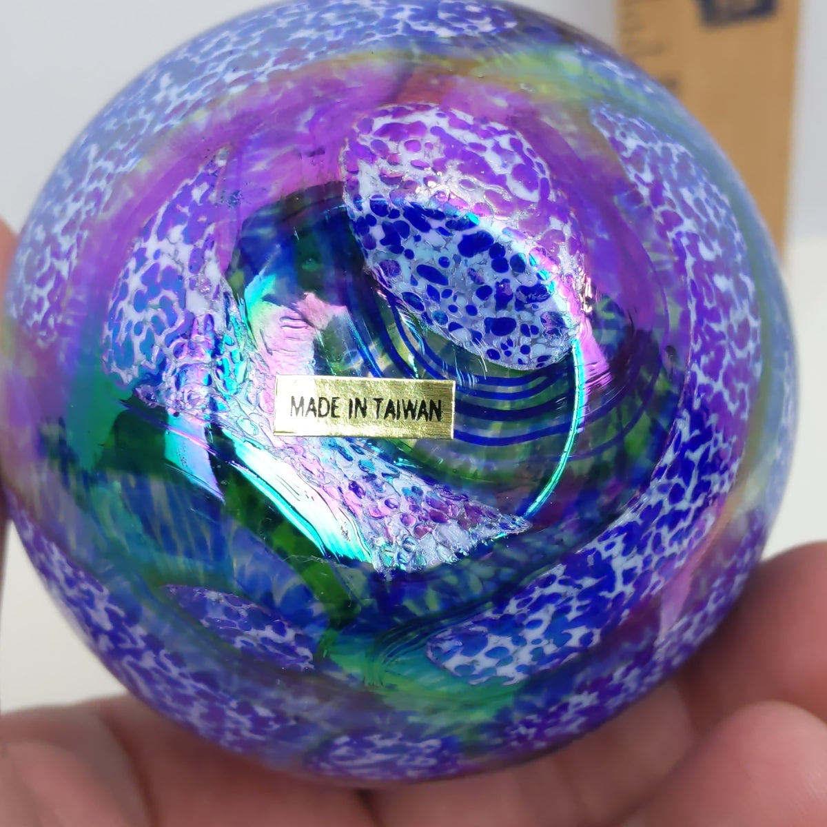 Add a touch of vintage charm to your home decor with this exquisite iridescent globe-shaped perfume bottle. Handmade with artisanal care, this unique piece is a true collector's item that will enhance the elegance of any vanity or dressing table. The intricate design and stunning craftsmanship of this perfume bottle make it a must-have for any lover of fine art and unique collectibles. Perfect for storing your favorite perfumes or as a decorative piece, this vintage perfume bottle is sure to impress.